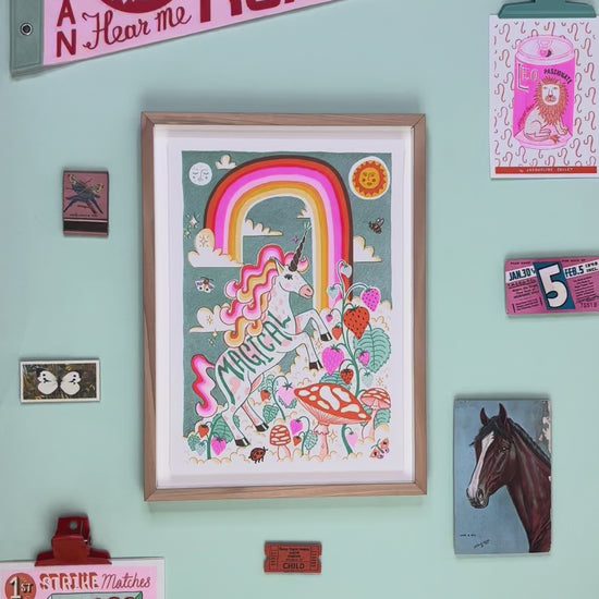 Bring a little enchantment into your day with this A4 Magical Unicorn Risograph Print. Bursting with colour, this whimsical artwork captures a joyful unicorn beneath a shimmering rainbow in a magical cloud forest — a delightful addition to any child’s room or nursery.
